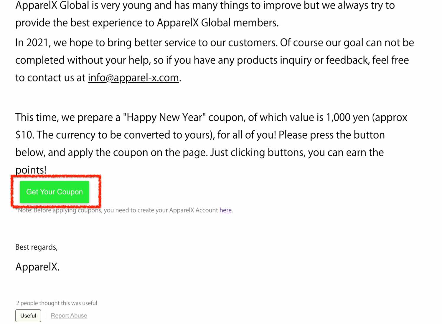 To celebrate 6000 new members who have joined ApparelX, we decided to extend the Happy New Year Coupon until the end of February 2021!