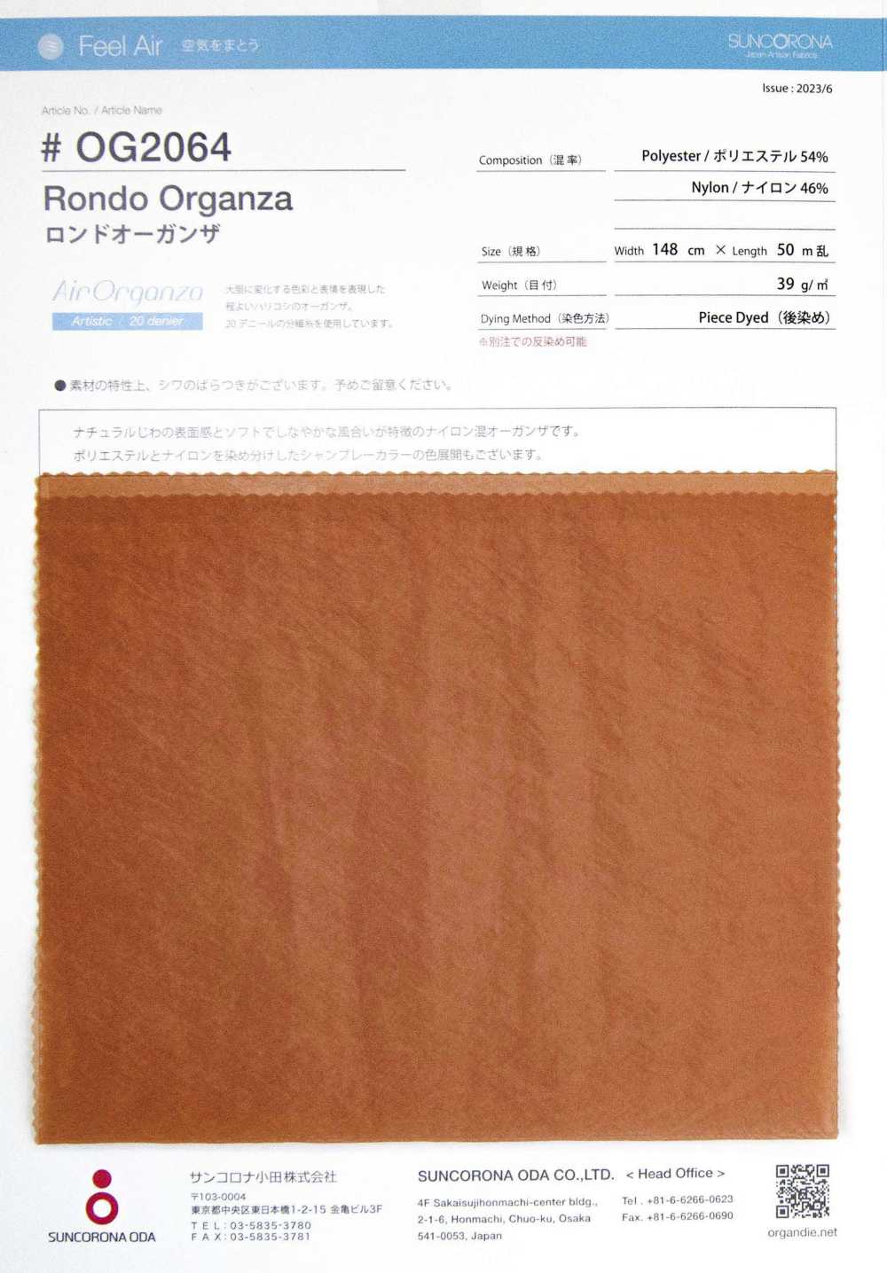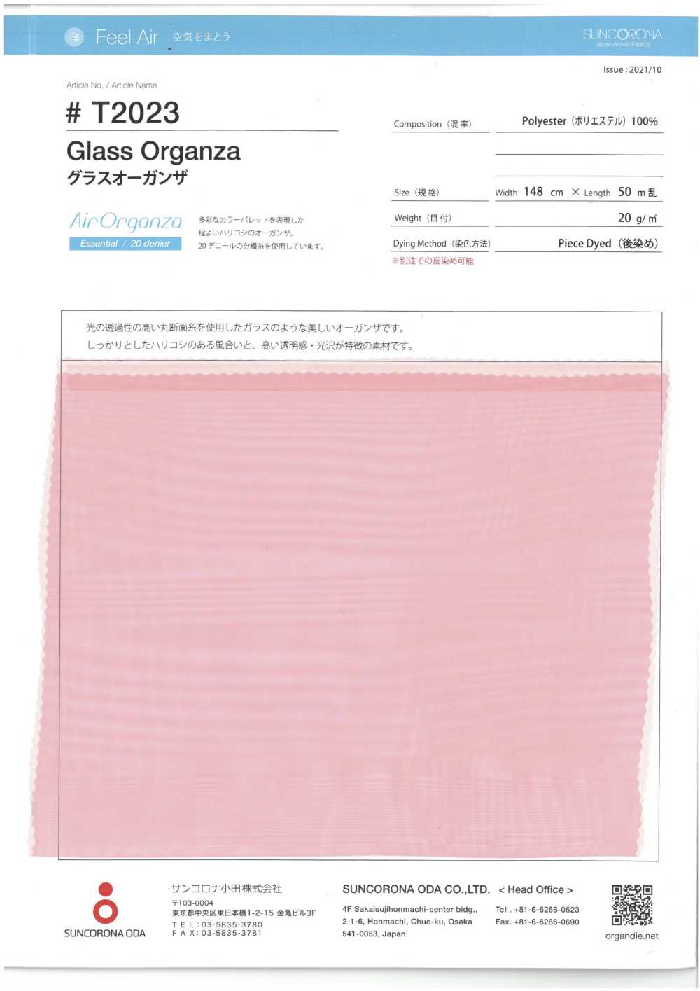organza features the natural coolness of cotton, and is processed with resin to give it just the right amount of firmness and crispness.