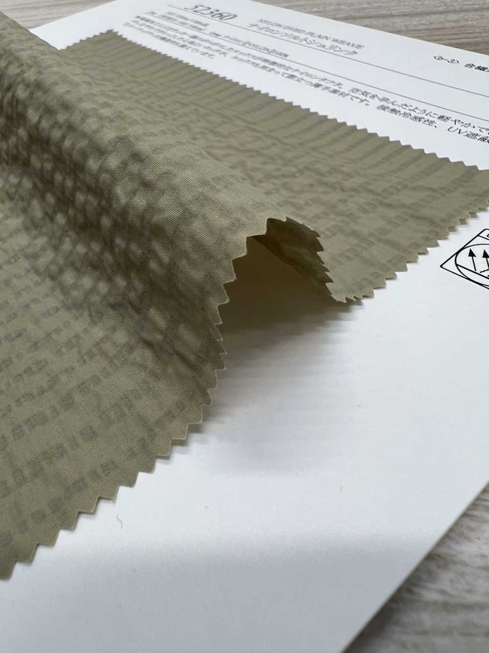 This textile has a cooling sensation to the touch and a UV blocking rate of over 80%, and also has a seersucker like appearance due to salt shrinkage processing.