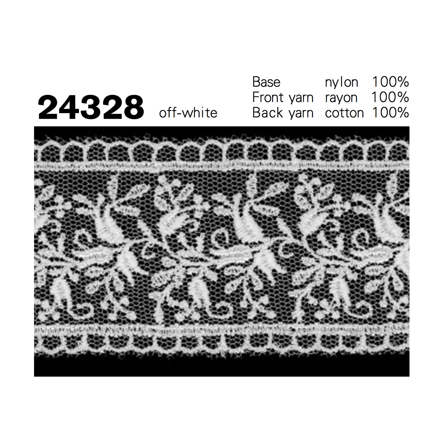 This lace is made by adding embroidery and other decorative elements to thin, mesh-like tulle. The delicate decorations stand out against the light tulle, and it is often used for wedding veils. The tulle has a firm texture, so it can also be used for dresses and ballet costumes.