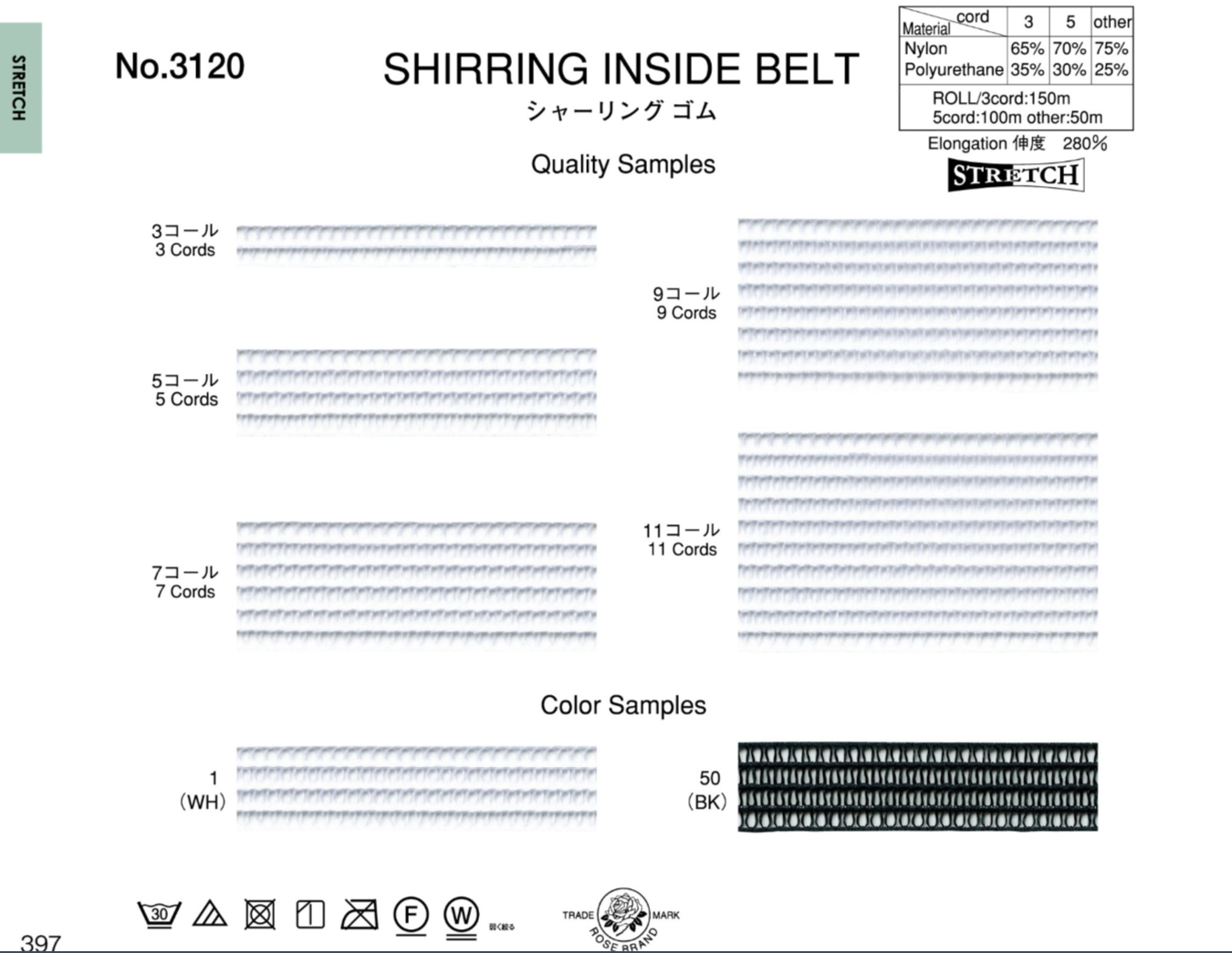 It is crisper and firmer than regular shirring elastic band, and has a non-fluffy texture. When the black color stretches, you can see some of the white core elastic band inside.