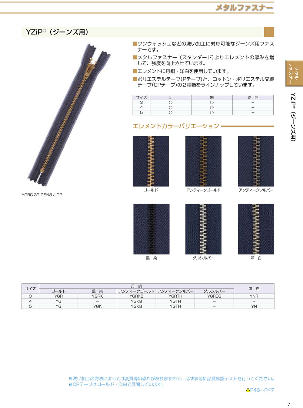 | Handling | About sewing Since "YZiP" for jeans is made of copper alloy, it may discolor due to roll response to chemicals such as acids, alkalis, reducing agents and sulfides. textile Please use a cloth that has been thoroughly washed and dried. In addition, these rolls are likely to occur when the temperature and humidity are high, so when using a steam iron to finish the product, dry it sufficiently before packaging. Post-processing Discoloration may occur due to residual tanning agent used in leather products. Use materials that have been thoroughly cleaned and neutralized after tanning. |