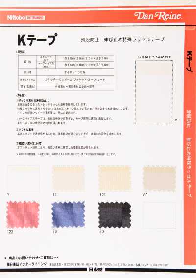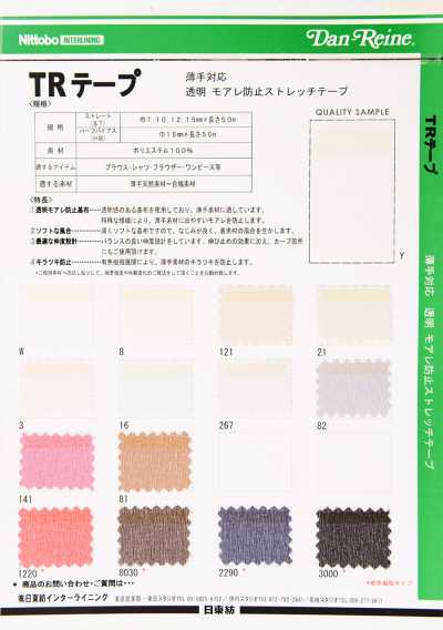 product number NTR-HB R-HB TR-HB K-HB Single thread-HB Product name Half Bias Tape Anti-stretch soft stretch tape, half bias TR-HB Moire Prevention Half Bias Tape Anti-slip half bias tape Single thread tape, stretch-resistant soft woven tape, half bias type Thumbnail Suitable materials Thin to medium thickness Synthetic and natural materials Synthetic and natural materials Thin natural to synthetic materials Medium to heavy synthetic and natural materials Thin to thick synthetic and natural materials Suitable items Blouses, browsers, dresses, jackets, coats Browser, dress, jacket, coat Blouses, shirts, blouses, dresses Browser, dress, jacket, suit, coat Browser, dress, jacket, suit, coat specification 15D 100% polyester 30D 100% polyester 30D 100% polyester 20D length x 40D width 100% nylon 65% polyester, 35% cotton remarks Thin tape that minimizes stains and glare Versatile, with moderate conformability and high adhesive performance Anti-moire effect, transparent, soft texture Anti-stretch special raschel tape High dimensional stability, spun woven tape