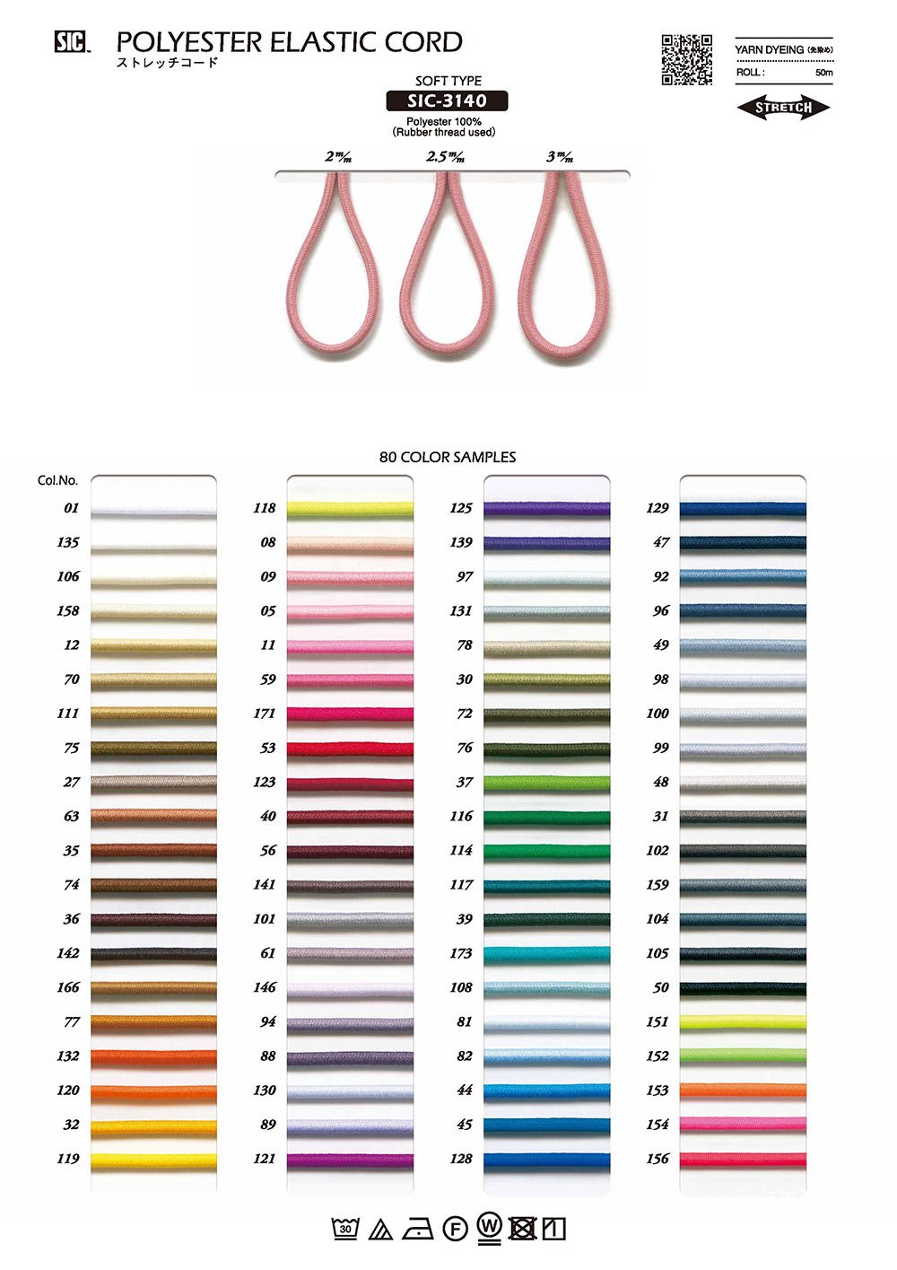 ◆ 3 sizes x 80 colors ◆ ⇔Stretch⇔ A simple soft round elastic band. Often used as a cord. We also have a silicone stopper that is perfect for this cord. (1 roll = 50 m) *This sample card includes actual samples of SIC-3140 and SIC-3141. One roll is 50 meters long. If you purchase by roll(R), you can purchase it at half the price per meter.