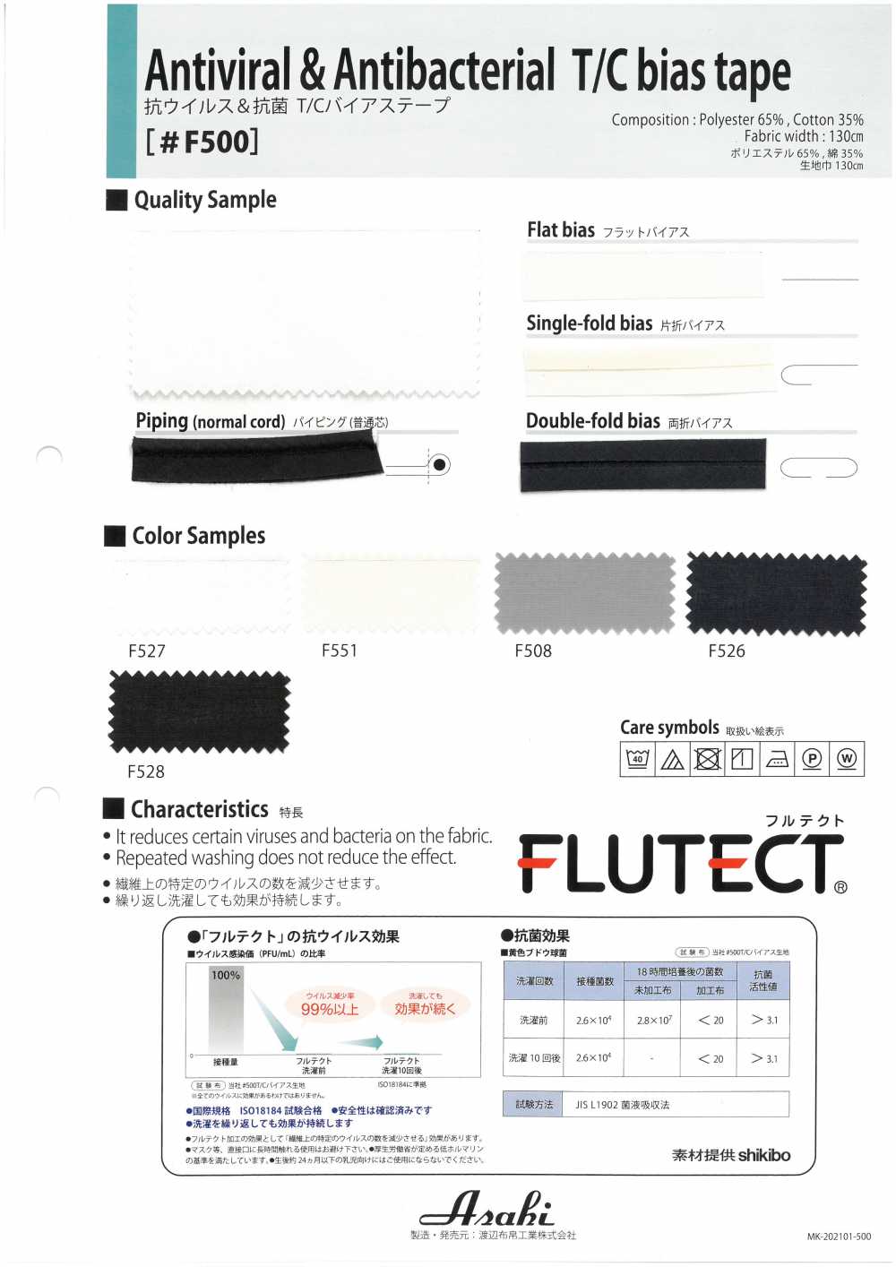 This is a double fold type. Bias tape with anti-virus, antibacterial processing technology, and FLUTECT® processing. Made of polyester and cotton, it has moderate softness. It is a product made of different materials and compatible with the product.