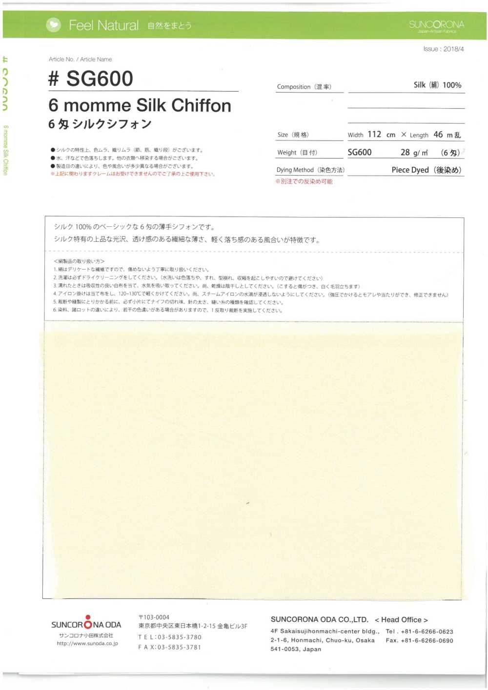 This is a basic 6 momme thin chiffon made from 100% silk. It features the elegant luster unique to silk, a delicate thinness with a translucent feel, and a light, drapey texture. *If ordering by roll, please enter 46 in the quantity field.